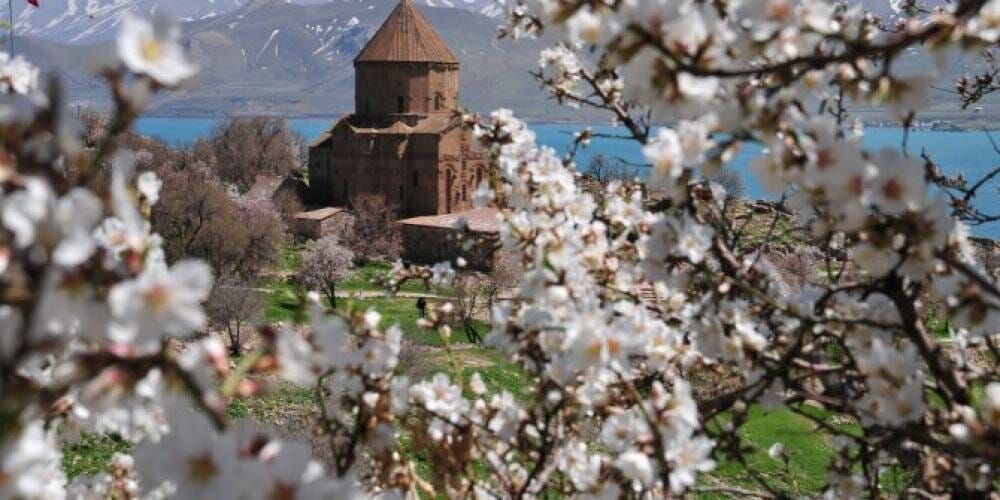 تزينت جزيرة آكدمار في ولاية وان شرقي تركيا بأزهار أشجار اللوز الوردية لترسم منظر ربيعي خلاب.