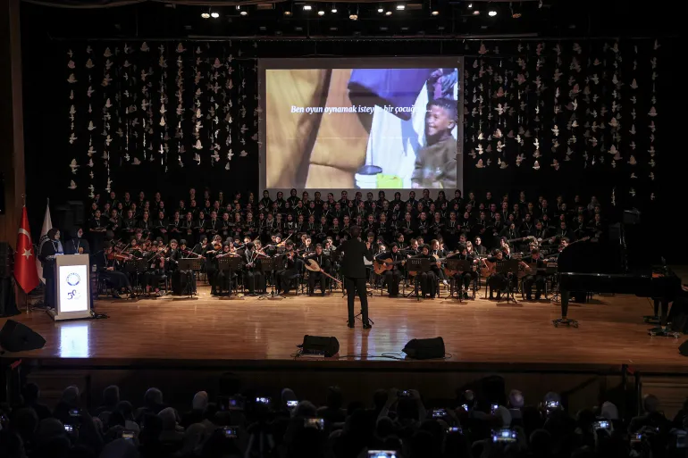 وأُقيم الحفل في المركز الثقافي التابع لجامعة “أولوداغ”، بمشاركة أوركسترا وجوقة ضخمة مؤلفة من 220 طالبا. وقدّم المشاركون عدة أغان تعبر عن معاناة الشعوب المضطهدة حول العالم.